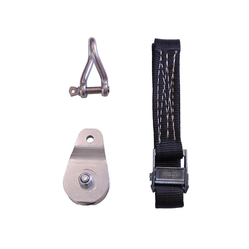 Balení obsahuje: kladku (průměr 50 mm), spojku s čepem a popruh (délka 1000 mm a šířka 35 mm)